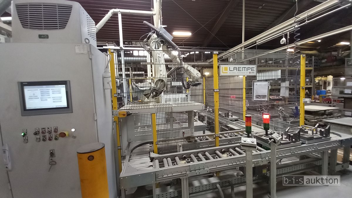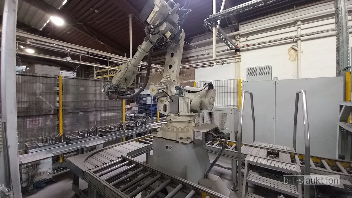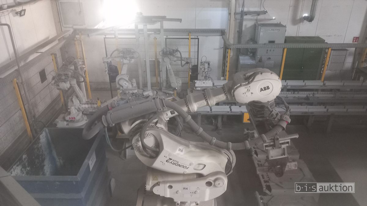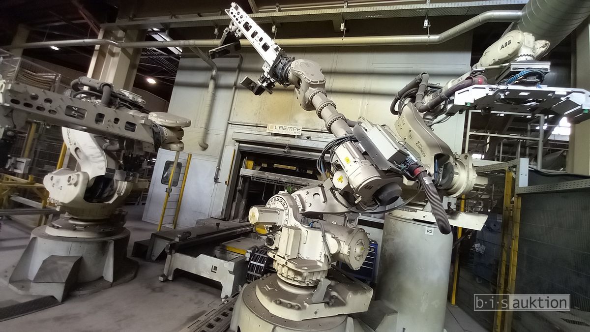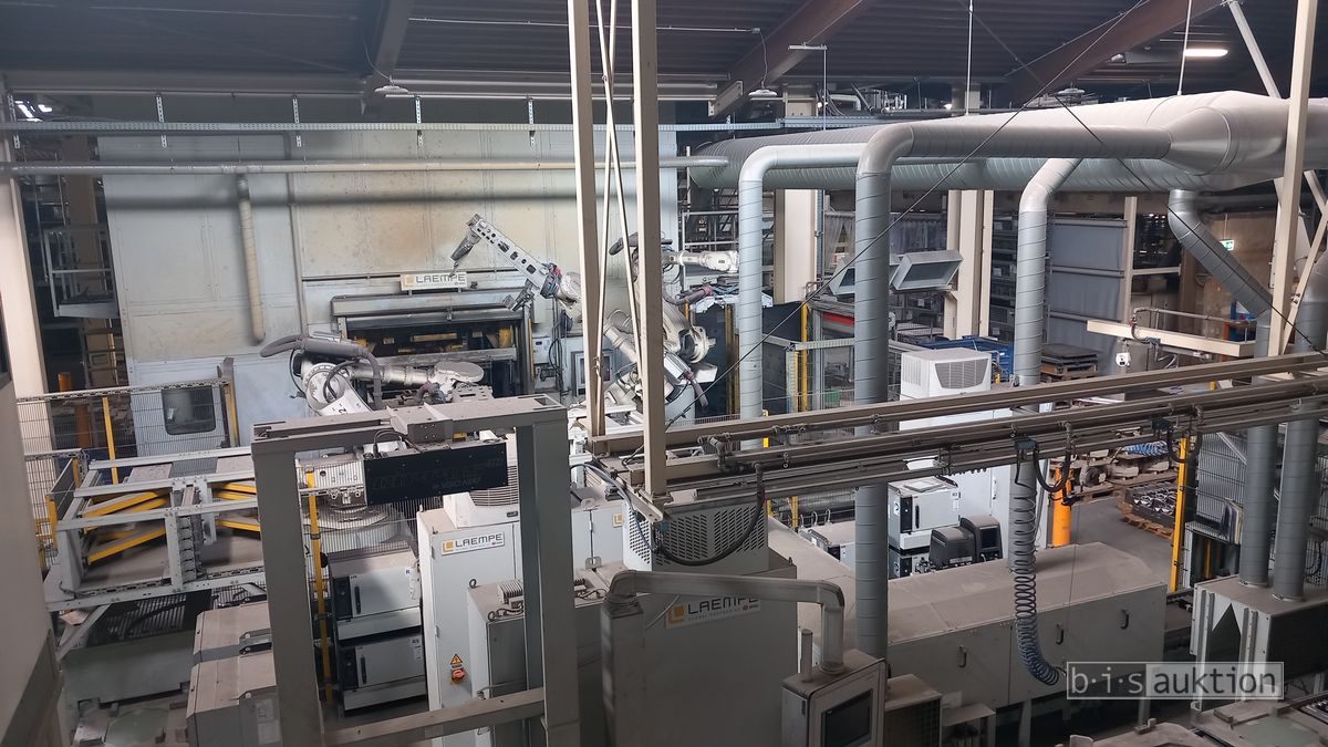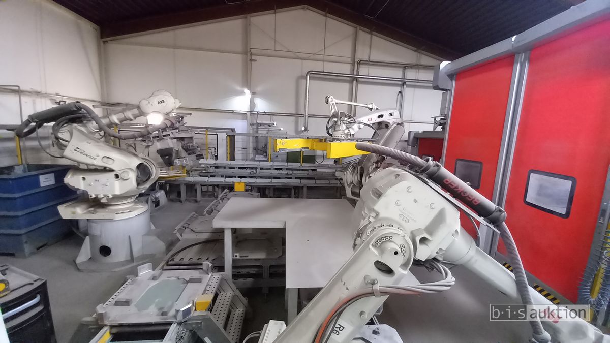 Fabr. Laempe Mössner Sinto, best aus 10 Industrie-Robotern, Fabr. ABB, Typ IRB 7600-325/3.1 bzw. IRB 6650S-125/3.5 bzw. IRB 4600-40/2.55 bzw. IRB 760-450/3.18 bzw. IRB 1600-10/1.45 jew. mit Schalt- und Steuerschrank sowie verschiedenen Greifern ausgerüstet, Ein- und Ausschleusstationen, 2 Entgrat-/Bürststationen, Visioninspektionssystem für Kerne, Typ Visio Nerf, Kokilleneinlegestation, 3 Montagetische, 1 Montagedrehtisch mit 3fach-Aufnahme, Klebeanlage Fabr. Meler/Bühnen, Beladebucht für Paletten, 2 Zuführbänder für Speiserkappen Fabr. Krups, Roboter-Tackereinheit, sowie Fördertechnik, Fabr. Krups mit dazugehörigen Werkzeugträgern, Bj. 2020