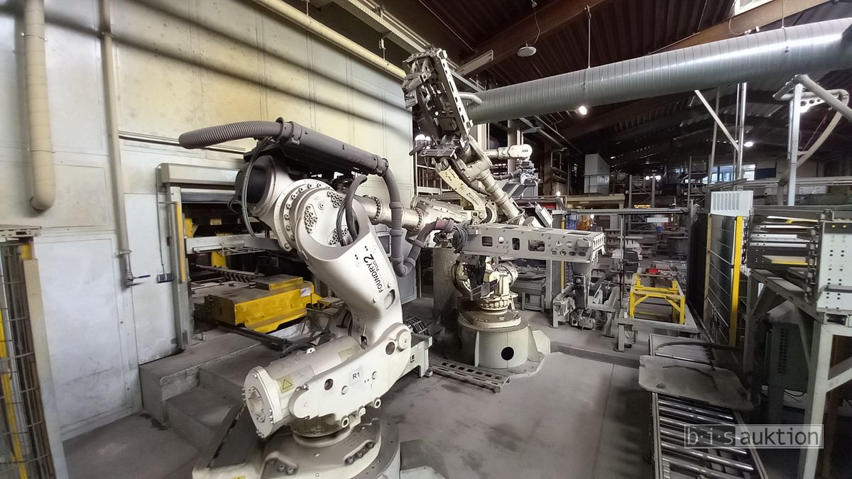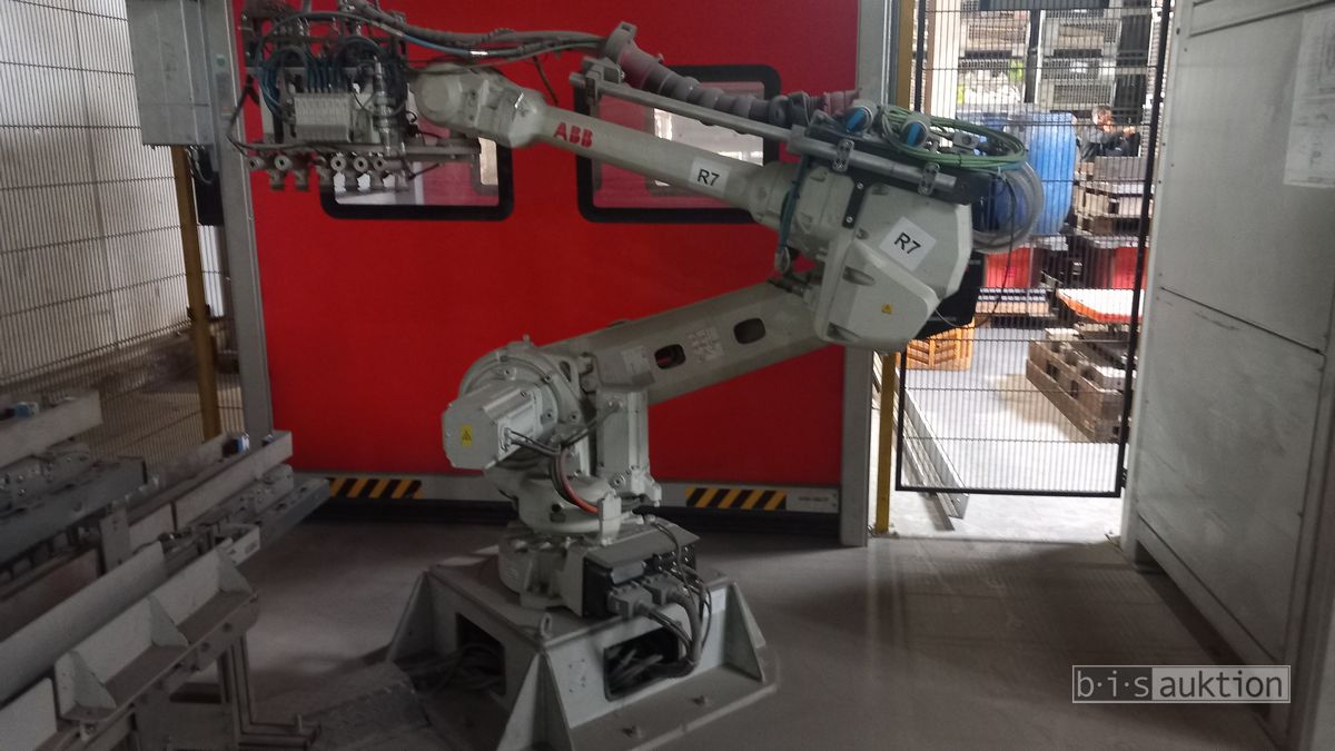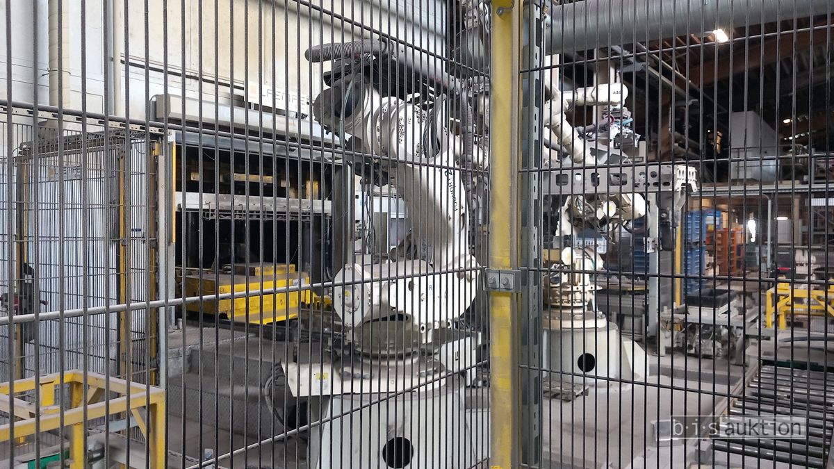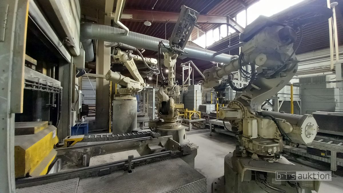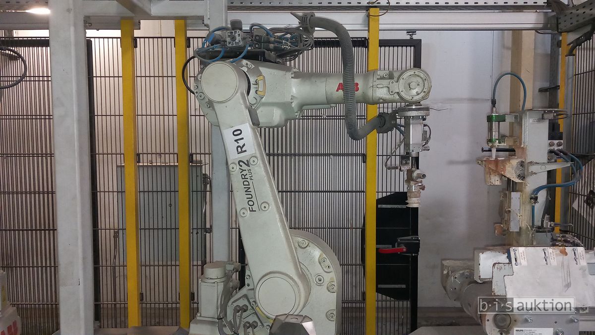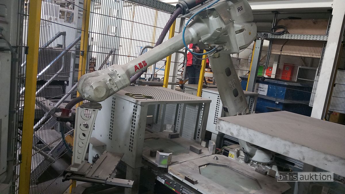 Fabr. Laempe Mössner Sinto, best aus 10 Industrie-Robotern, Fabr. ABB, Typ IRB 7600-325/3.1 bzw. IRB 6650S-125/3.5 bzw. IRB 4600-40/2.55 bzw. IRB 760-450/3.18 bzw. IRB 1600-10/1.45 jew. mit Schalt- und Steuerschrank sowie verschiedenen Greifern ausgerüstet, Ein- und Ausschleusstationen, 2 Entgrat-/Bürststationen, Visioninspektionssystem für Kerne, Typ Visio Nerf, Kokilleneinlegestation, 3 Montagetische, 1 Montagedrehtisch mit 3fach-Aufnahme, Klebeanlage Fabr. Meler/Bühnen, Beladebucht für Paletten, 2 Zuführbänder für Speiserkappen Fabr. Krups, Roboter-Tackereinheit, sowie Fördertechnik, Fabr. Krups mit dazugehörigen Werkzeugträgern, Bj. 2020