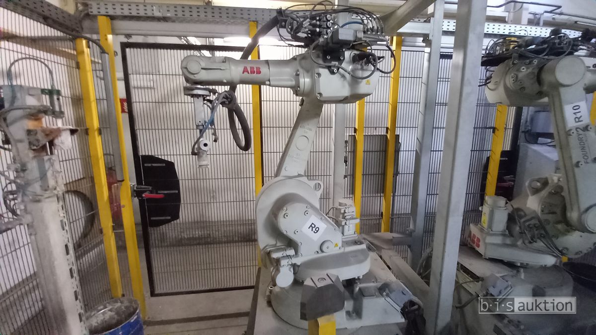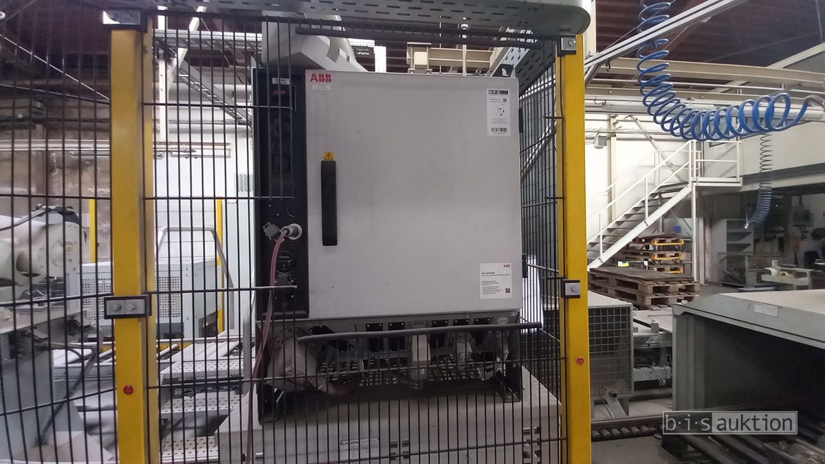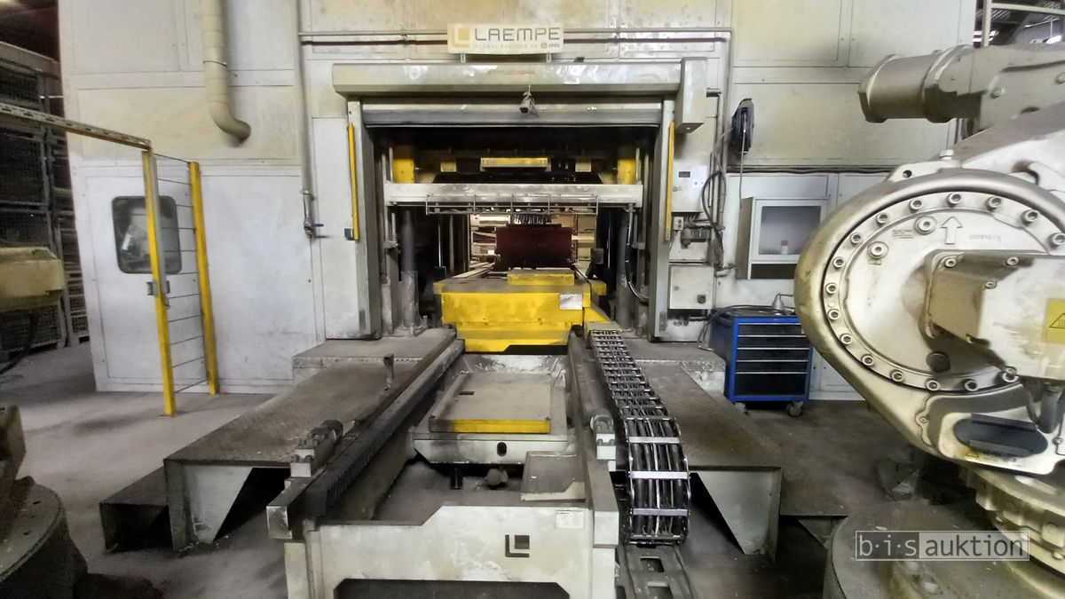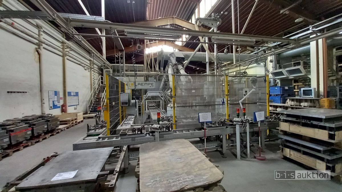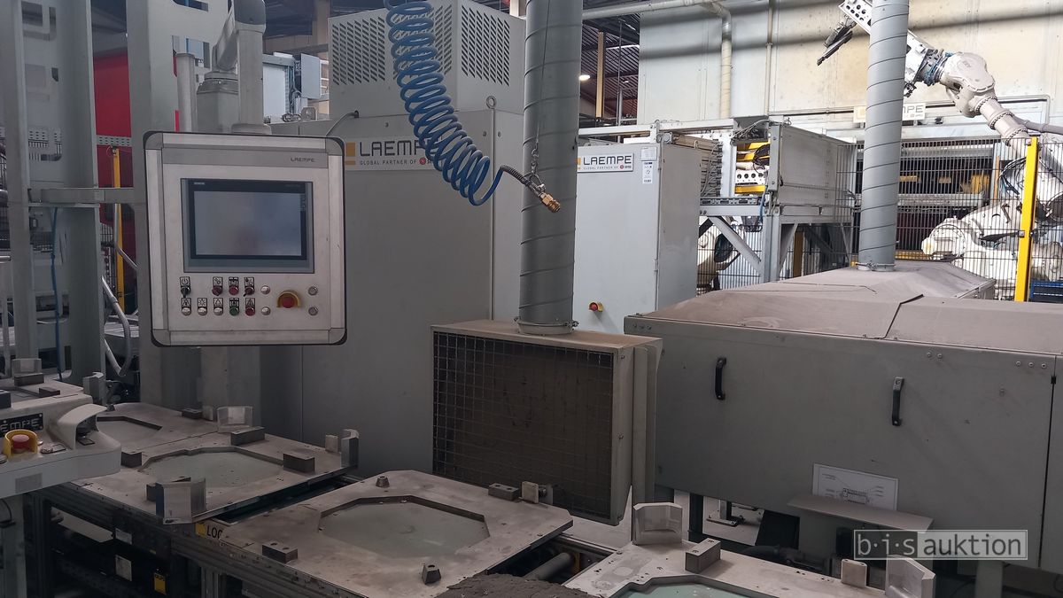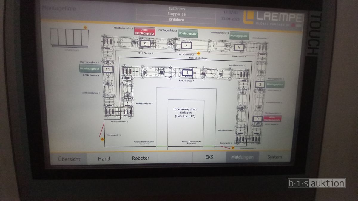 Fabr. Laempe Mössner Sinto, best aus 10 Industrie-Robotern, Fabr. ABB, Typ IRB 7600-325/3.1 bzw. IRB 6650S-125/3.5 bzw. IRB 4600-40/2.55 bzw. IRB 760-450/3.18 bzw. IRB 1600-10/1.45 jew. mit Schalt- und Steuerschrank sowie verschiedenen Greifern ausgerüstet, Ein- und Ausschleusstationen, 2 Entgrat-/Bürststationen, Visioninspektionssystem für Kerne, Typ Visio Nerf, Kokilleneinlegestation, 3 Montagetische, 1 Montagedrehtisch mit 3fach-Aufnahme, Klebeanlage Fabr. Meler/Bühnen, Beladebucht für Paletten, 2 Zuführbänder für Speiserkappen Fabr. Krups, Roboter-Tackereinheit, sowie Fördertechnik, Fabr. Krups mit dazugehörigen Werkzeugträgern, Bj. 2020