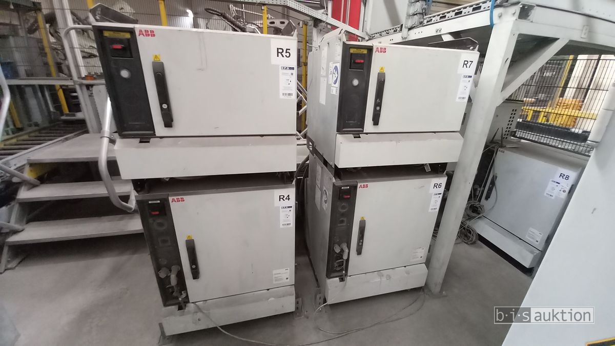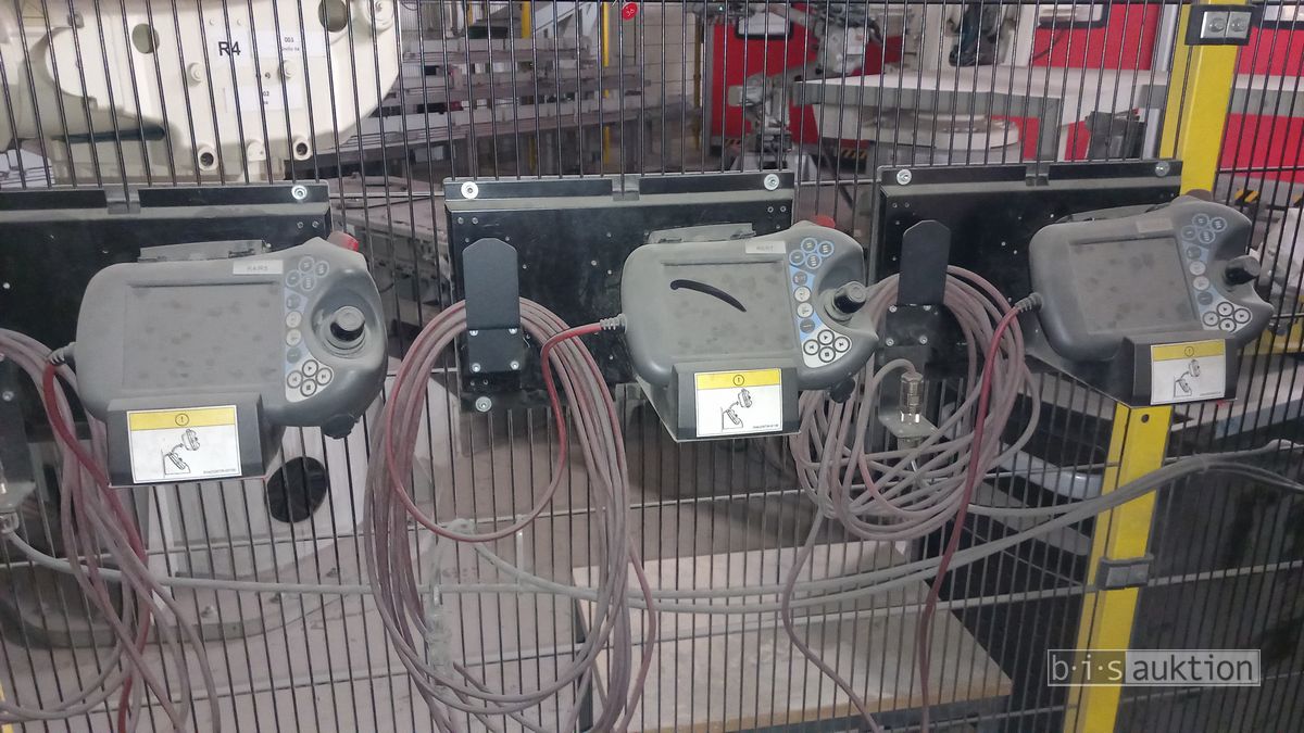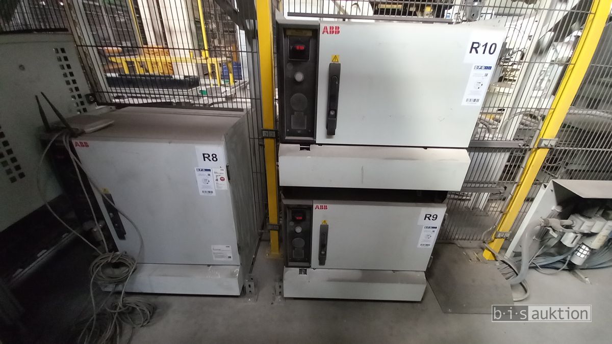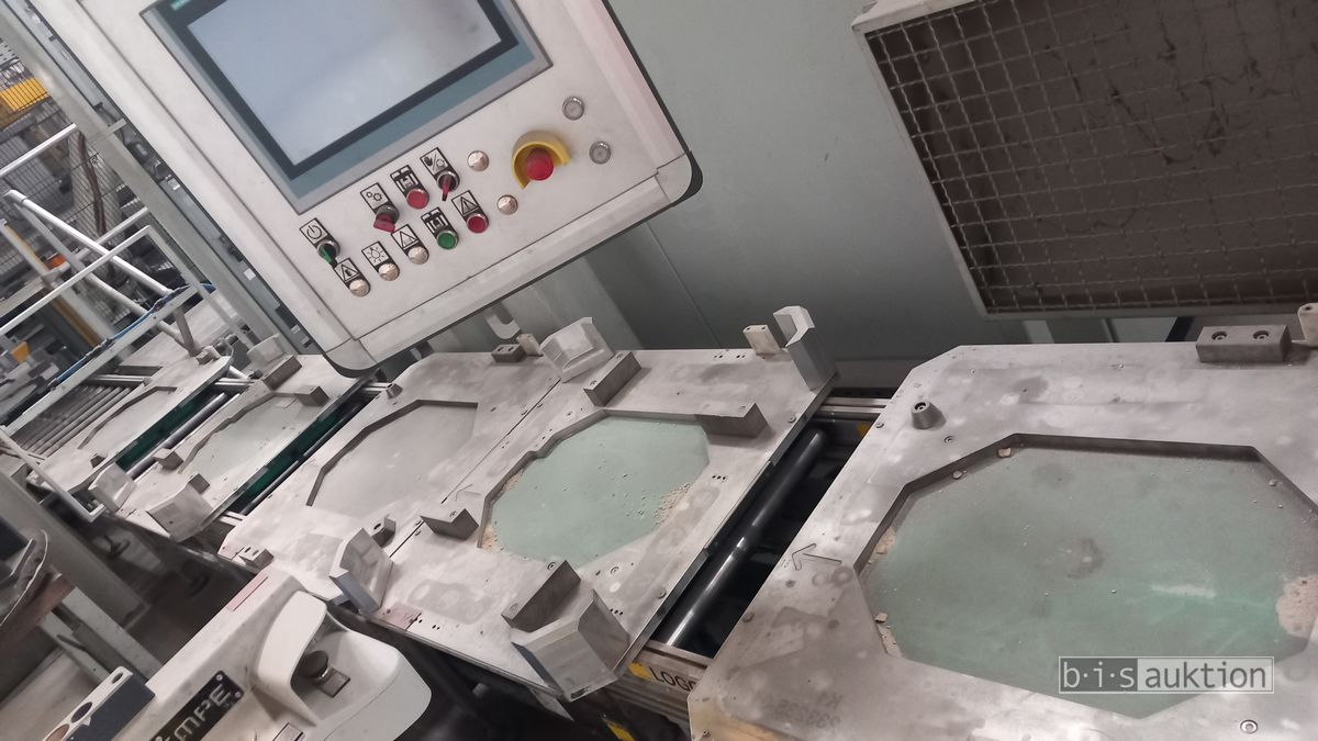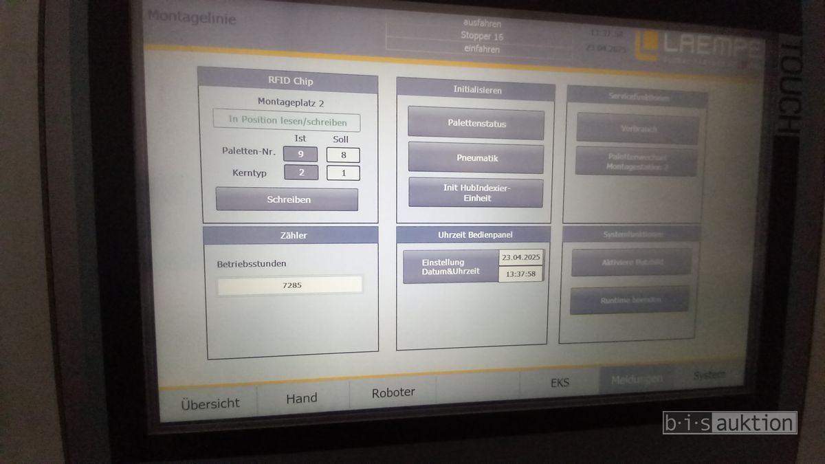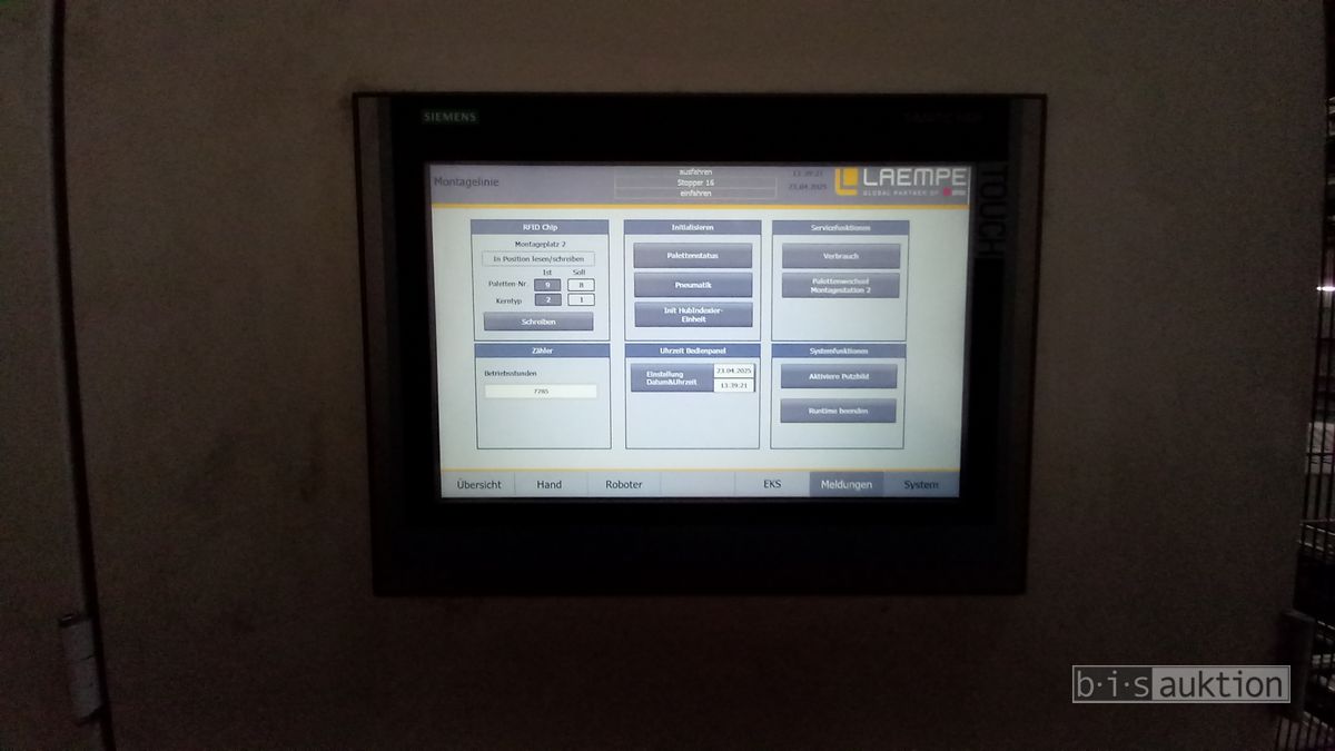 Fabr. Laempe Mössner Sinto, best aus 10 Industrie-Robotern, Fabr. ABB, Typ IRB 7600-325/3.1 bzw. IRB 6650S-125/3.5 bzw. IRB 4600-40/2.55 bzw. IRB 760-450/3.18 bzw. IRB 1600-10/1.45 jew. mit Schalt- und Steuerschrank sowie verschiedenen Greifern ausgerüstet, Ein- und Ausschleusstationen, 2 Entgrat-/Bürststationen, Visioninspektionssystem für Kerne, Typ Visio Nerf, Kokilleneinlegestation, 3 Montagetische, 1 Montagedrehtisch mit 3fach-Aufnahme, Klebeanlage Fabr. Meler/Bühnen, Beladebucht für Paletten, 2 Zuführbänder für Speiserkappen Fabr. Krups, Roboter-Tackereinheit, sowie Fördertechnik, Fabr. Krups mit dazugehörigen Werkzeugträgern, Bj. 2020